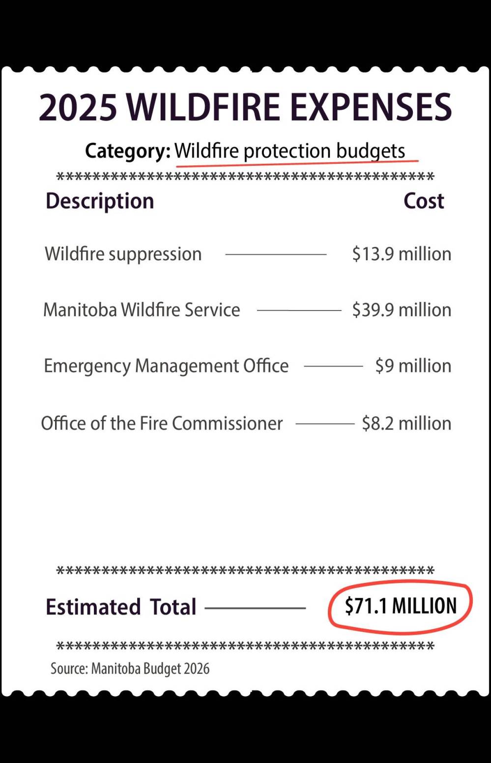 To put that figure in perspective, the combined operating budgets of the Environment and Climate Change Department ($117 million) and the Department of Natural Resources ($147 million) totalled $264 million, meaning Manitoba spent 42 per cent more on emergency wildfire expenses last year.