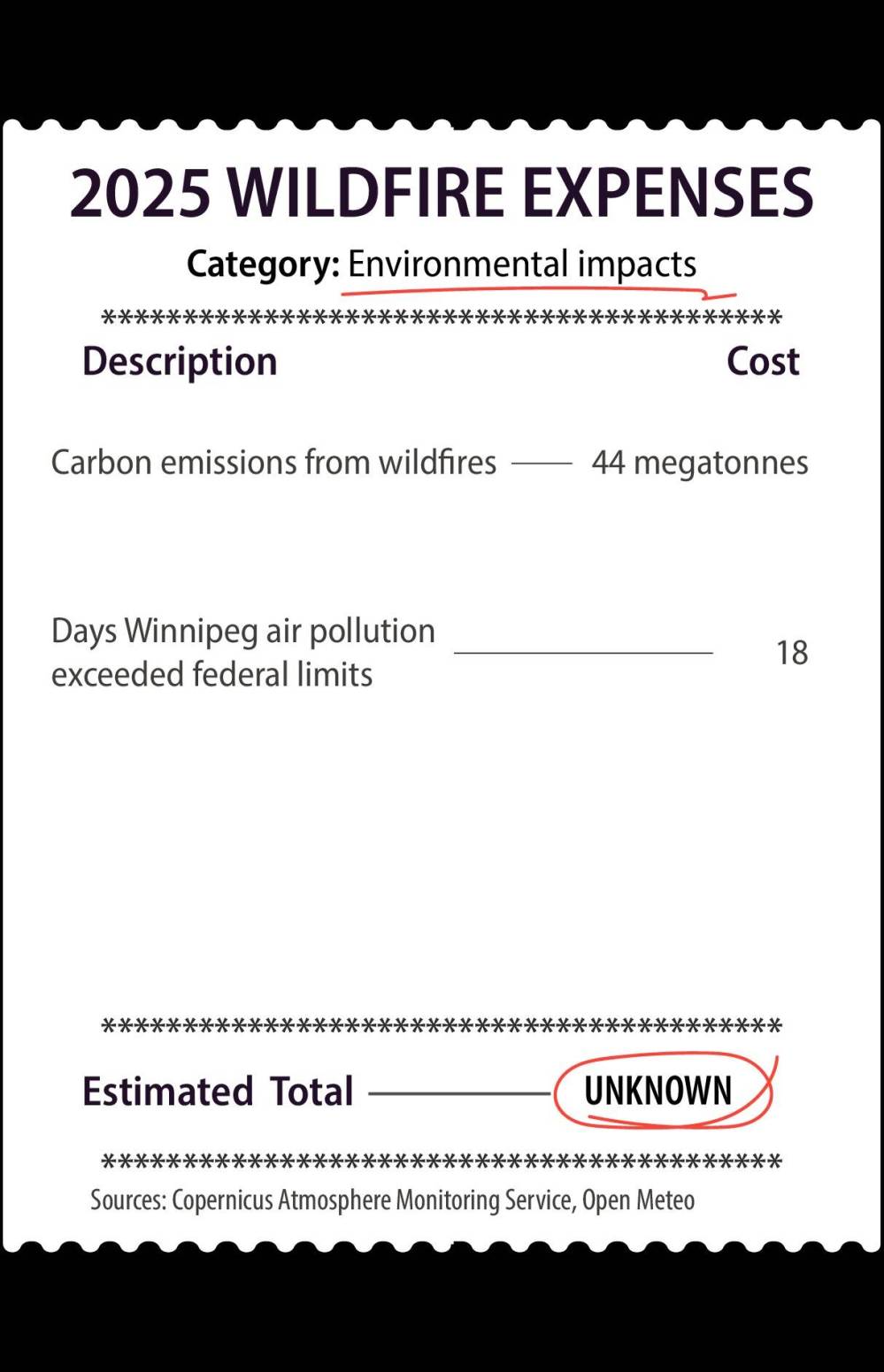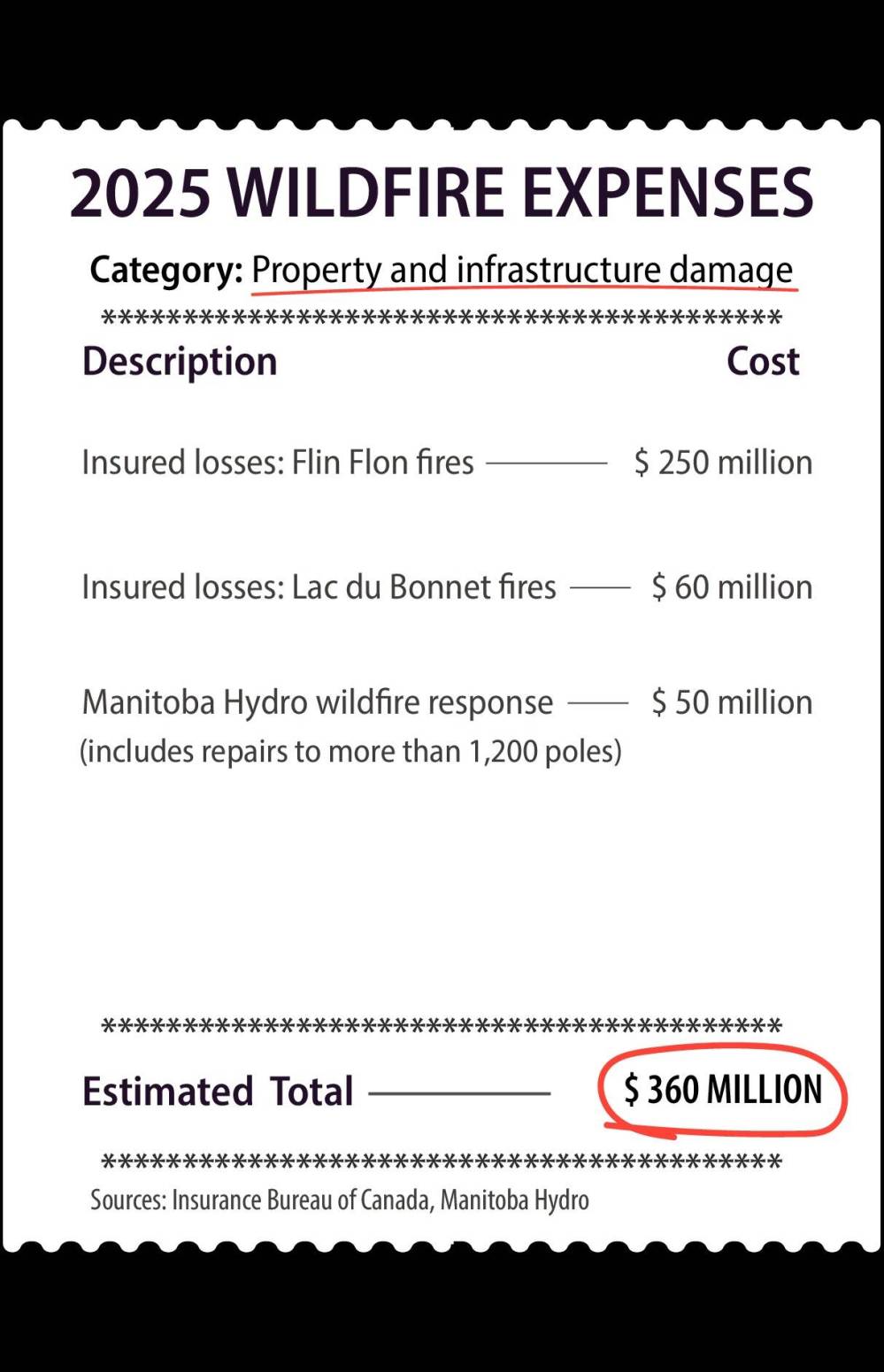 The costs compiled here represent only a portion of the long-term economic impacts wildfires will have on Manitoba’s economy. It will take several months for government agencies and private companies to finish taking stock of the damage; some losses will never show up in financial records or industry reports.