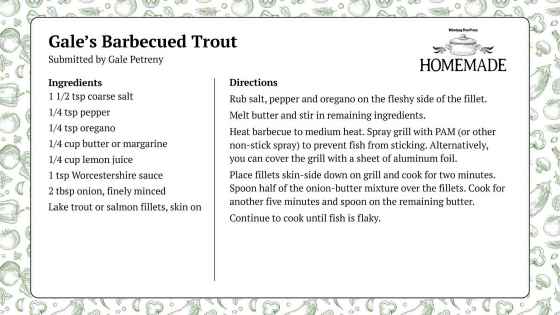 Enjoy this week’s recipe for barbecued trout from Gale Petreny.