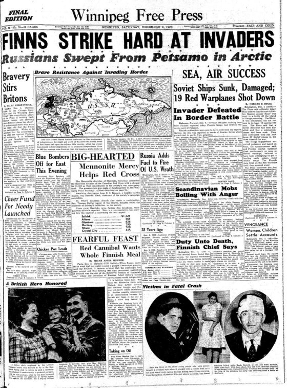 On Dec. 2, 1939: The Winnipeg Free Press reported in Norway, civilian refugees arriving from Finland said Finnish troops had retaken the Arctic port of Petsamo from invading Soviet troops. Finland also reported sinking or disabling several Russian ships and shooting down 19 warplanes. Demonstrators across the Scandinavian countries protested the Soviet Union’s invasion of Finland. Search our archives for more here.