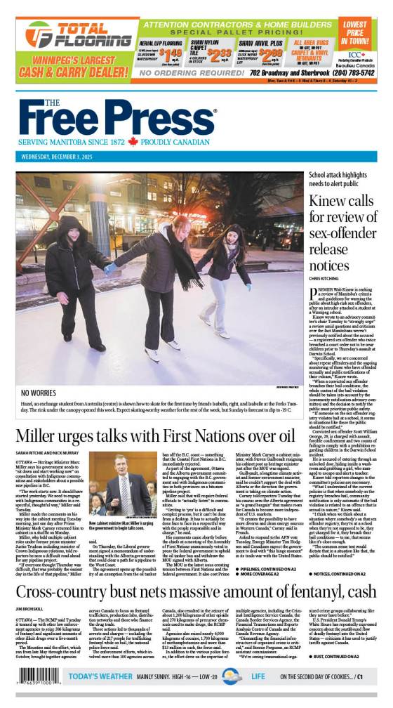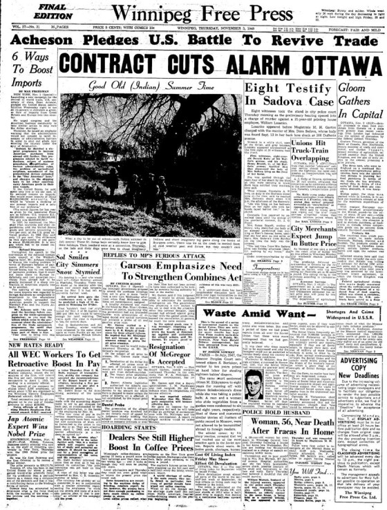 On Dec. 3, 1949: The Winnipeg Free Press reported British proposals to slash food purchases from Canada, on a scale greater than recent warnings from London indicated, were the subject of critical discussion in Ottawa. The U.S. secretary of state pledged the administration would use all its powers to stimulate a greater flow of imports from Great Britain and Europe to the United States. In Winnipeg, eight witnesses took the stand in police court in a preliminary hearing into a charge of murder against a 21-year-old printing house employee. Search our archives for more here.