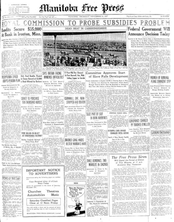 On Nov. 10, 1927: The Manitoba Free Press reported in Ottawa, the federal government would announce a royal commission to probe the issue of federal subsidies to provinicial governments. The opening of development of Slave Falls as a power generating site for the city of Winnipeg was approved by the committee on public utilities. In Ironton, Minn., bank robbers stole $35,000. Read the rest of this day’s paper here. Search our archives for more here.