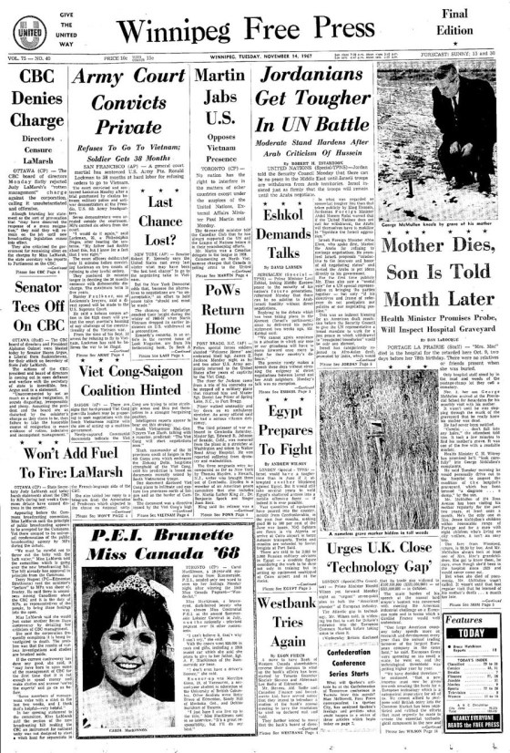On Nov. 14, 1967: The Winnipeg Free Press reported in San Francisco, a court martial sentenced a U.S. Army private to 38 months of hard labour for refusing orders to go to Vietnam. The son of a 78-year-old woman who died while in a Portage la Prairie hospital for people with mental disabilities was not told of his mother’s death, and only learned of it nearly a month later when he came to visit her; the provincial health minister promised to personally look into the matter. Read the rest of this day’s paper here. Search our archives for more here.