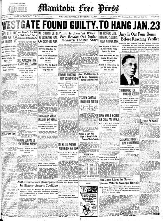 On Nov. 17, 1928: The Manitoba Free Press reported a jury, after deliberating four hours, found Albert Victor Westgate guilty of murder in the death of Christine Adams, and Justice Dysart sentenced him to be hanged; Westgate’s final words to the court were: “I am not guilty.” Two groceries, one on Bowman Avenue and the other on Manitoba Avenue, were the scenes of attempted robberies, but the grocers managed to outwit the would-be thieves. Search our archives for more here.