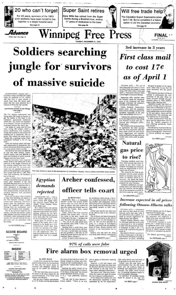 On Nov. 21, 1978: The Winnipeg Free Press reported Guyanese troops searched for hundreds of U.S. cultists who fled from a mass suicide in which 400 others died at Jonestown, which had been established by Rev. Jim Jones and his People’s Temple four years earlier. In Canada, the cost of first-class mail would increase to 17 cents an ounce, up from 14 cents. A task force headed by the Winnipeg fire department recommended that city fire alarm boxes be removed and that telephone booths be used by the public for emergency calls. Search our archives for more here.