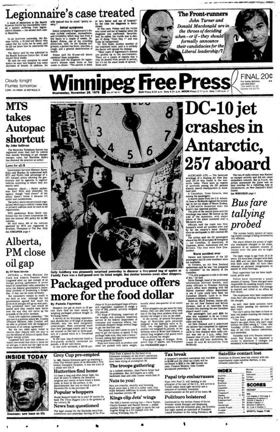 On Nov. 28, 1979: The Winnipeg Free Press reported a team of physycians at Health Sciences Centre successfully treated a patient with legionnaire’s disease, the second such case in Manitoba. The Manitoba Telephone System registered more than half the vehicles in its fleet outside Winnipeg to get cheaper Autopac rates, but Manitoba Hydro shunned the practice as unfair. The burnt-out wreckage of a missing New Zealand DC-10 was found in the Antarctic; there were no reports of survivors among the 257 people aboard. Search our archives for more here.