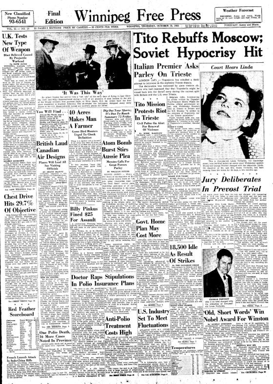 Oct. 15, 1953: It was shorts weather. This edition of the Winnipeg Free Press advised Winnipeggers to prepare for balmy temperatures with an expected high of 24 C. It turned out to be a record high for this time of year as the mercury rose to nearly 26 C (78 F). The high cost of providing polio treatment in Manitoba, as well as the daily polio case counts, was front-page news. On this day, Sir Winston Churchill was awarded the Nobel Prize for literature for his historical writings. Read the rest of this day’s paper here. Search our archives for more here.