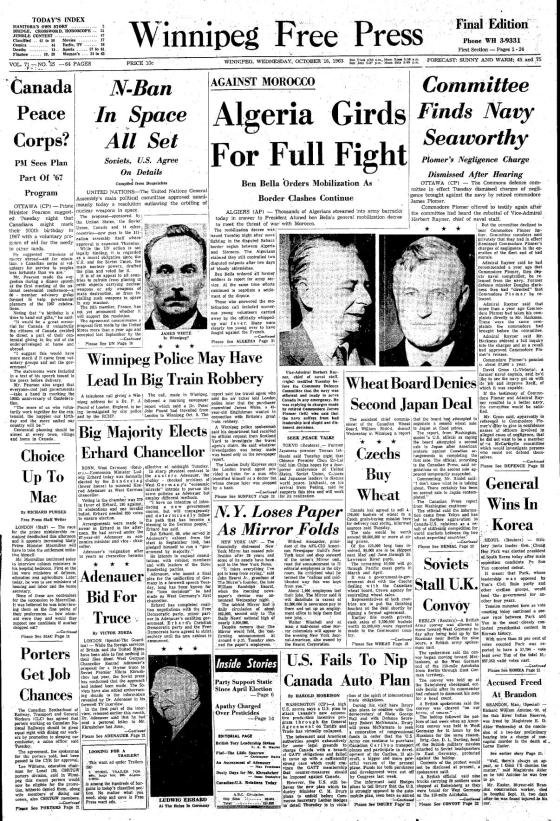 On Oct. 16, 1963: The Winnipeg Free Press reported the United Nations unanimously voted to ban nuclear weapons in space. Closer to home, government planning was underway for Canada’s centennial celebrations in 1967. Prime minister Lester B. Pearson pitched a Peace Corps-style aid program, suggesting Canadians, through volunteer organizations, could help underprivileged people at home and abroad as part of the centennial. And Winnipeg police received an ultimately unproven tip about a possible Winnipeg connection to the then-unsolved Great Train Robbery — a heist in which a group of men stole GBP2.6 million from a Royal Mail train outside of London, England.