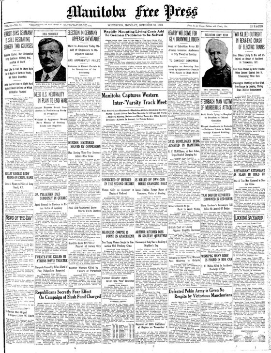 On Oct. 20, 1924: The Manitoba Free Press reported farmhand Adolf Stark of Steinbach was in a Brandon hospital after a near-fatal assault by three men; police had arrested two suspects before a third man named James Fraser walked into the police station to give himself up. In Germany, the rapidly increasing cost of living added to political tensions and it looked likey the Reichstag would be dissolved and an election called. Read the rest of this day’s paper here. Search our archives for more here.