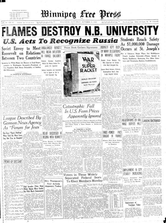 On Oct. 21, 1933: The Winnipeg Free Press reported Manitoba premier R.B. Bennett was headed to Ottawa to meet with the prime minister after hearing from delegations of wheat-growers. The first snowfall of the season blanketed Winnipeg and parts of Manitoba, and local unemployment rates were declining.