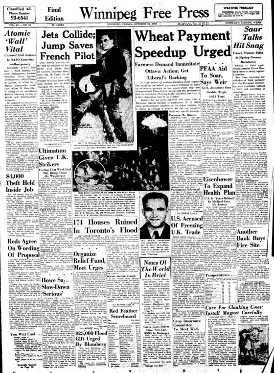 On Oct. 22, 1954: The Winnipeg Free Press reported a large section of western Canada’s farm population urged Ottawa to speed up an interim payment for the previous year’s wheat crop. The only known survivor of an in-air collision of two RCAF T-33 Silver Star jet trainers over bush country east of Lake Winnipeg was a French pilot; two Canadian airmen, one of them from Winnipeg, were still missing; one body had been recovered. Read the rest of this day’s paper here. Search our archives for more here.