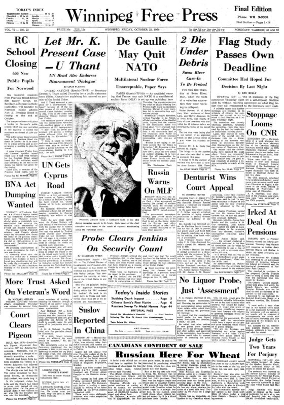 On Oct. 23, 1964: The Winnipeg Free Press reported that 600 students at Roman Catholic institution Precious Blood School would transfer to Norwood public schools on Nov. 2, as Precious Blood would be closing at the end of October. Unofficial word in Paris was that France could quit NATO if a multilateral nuclear force were created. The Manitoba Court of Appeal allowed an appeal by a Winnipeg denturist against a conviction for illegally making false teeth. Read the rest of this day’s paper here. Search our archives for more here.