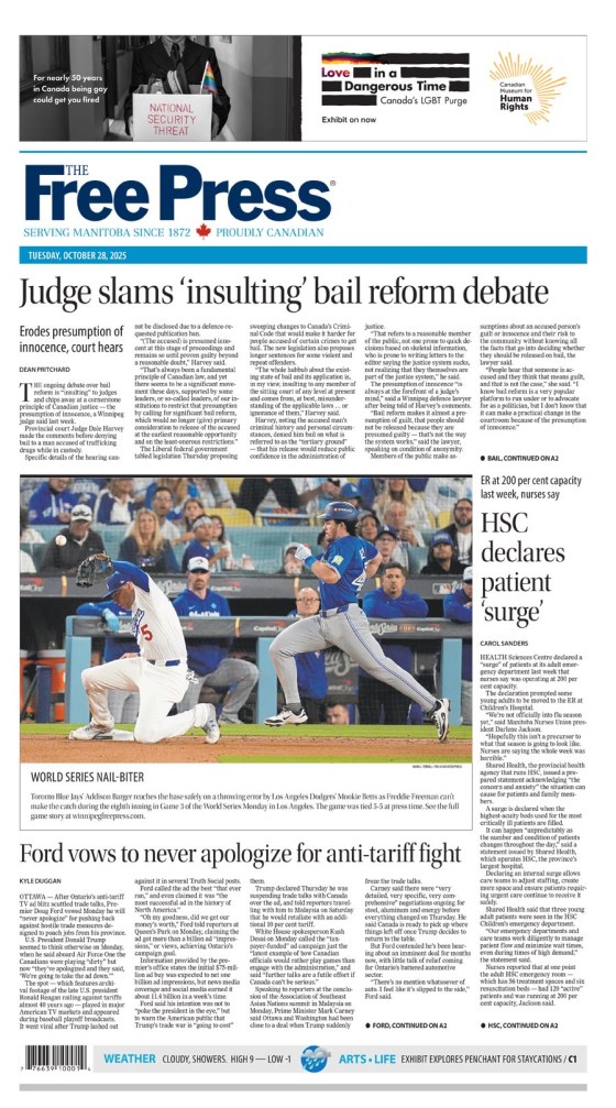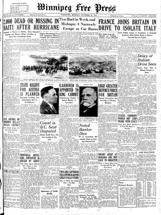 On Oct. 28, 1935: The Winnipeg Free Press reported France informed the League of Nations it would impose economic sanctions on Italy, joining Britain in isolating Benito Mussolini over his war with Ethiopia. Saskatchewan premier James Gardiner was appointed to the federal cabinet as minister of agriculture. Automobile mishaps in Winnipeg and the surrounding area injured 10 over the weekend, putting five in hospital. Read the rest of this day’s paper here. Search our archives for more here.