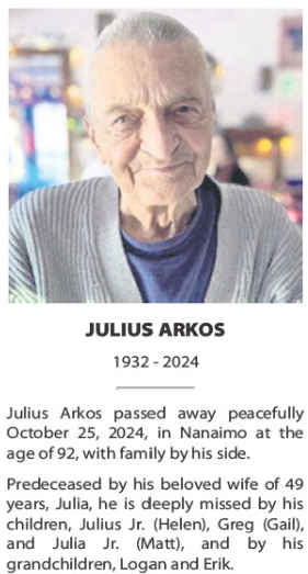 Julius Arkos and his wife fled Hungary and left their careers behind. Julius, who was 92 when he died on Oct. 25, had worked in theatre, film and TV while his wife was a ballerina and artistic director. To make a better future for their first-born son and future children, the family came to Winnipeg, where Julius worked at CN Rail until retiring. Read more about Julius.