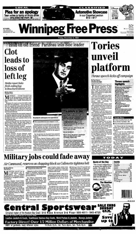 On Dec. 2, 1994: The Winnipeg Free Press reported that Bloc Québécois leader Lucien Bouchard had to have his leg amputated as a result of an infection with flesh-eating bacteria; he had been admitted to hospital with a blood clot in his leg. In Manitoba, the Filmon Tories offered a glimpse at their platform in the upcoming provincial election with their Speech from the Throne. It was feared that Manitoba could lose up to 1,000 military jobs under a proposed restructuring of the Armed Forces. READ MORE