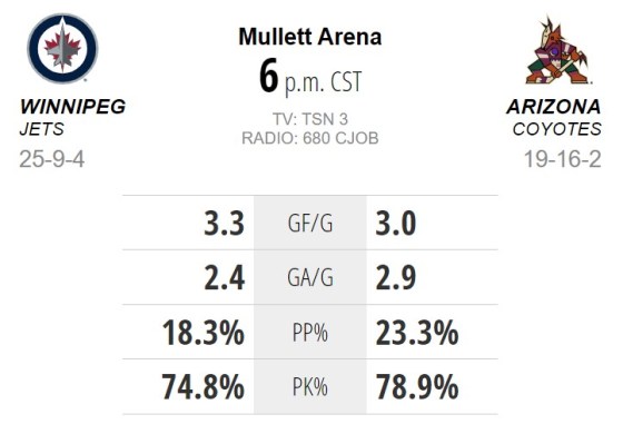 Neither team held a morning skate but the Jets are expected to go with the same forwards and defencemen. Connor Hellebuyck will get the start in net. The Coyotes are coming off consecutive home losses to the Florida Panthers and New York Islanders in which they’ve been outscored 9-2, so you know they’ll be looking to bring a much better effort. Karel Vejmelka, who always seems to play well against Winnipeg, will start in net.