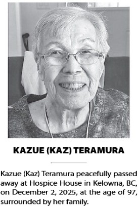 Her family was forced from their Pitt Meadows, B.C., home during the Second World War and relocated to Alberta. She later came to southern Manitoba and then Winnipeg, supported the Manitoba Buddhist Temple, and retired to Kelowna.