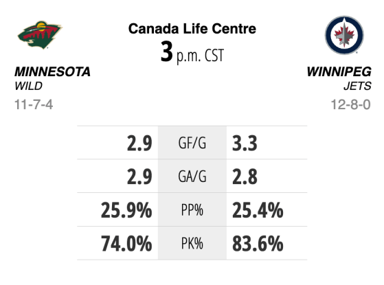 The recent resurgence has pushed the Jets up to sixth in the NHL, while the Wild penalty kill is 28th overall (though they’re 15th on the road at 80 per cent efficiency).