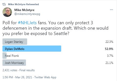 Dylan DeMelo? Really?! I ran a Twitter poll the other day, asking followers which of four Jets defencemen you’d leave unprotected for the upcoming Seattle Kraken expansion draft. The choices were DeMelo, Josh Morrissey, Neal Pionk and Logan Stanley.