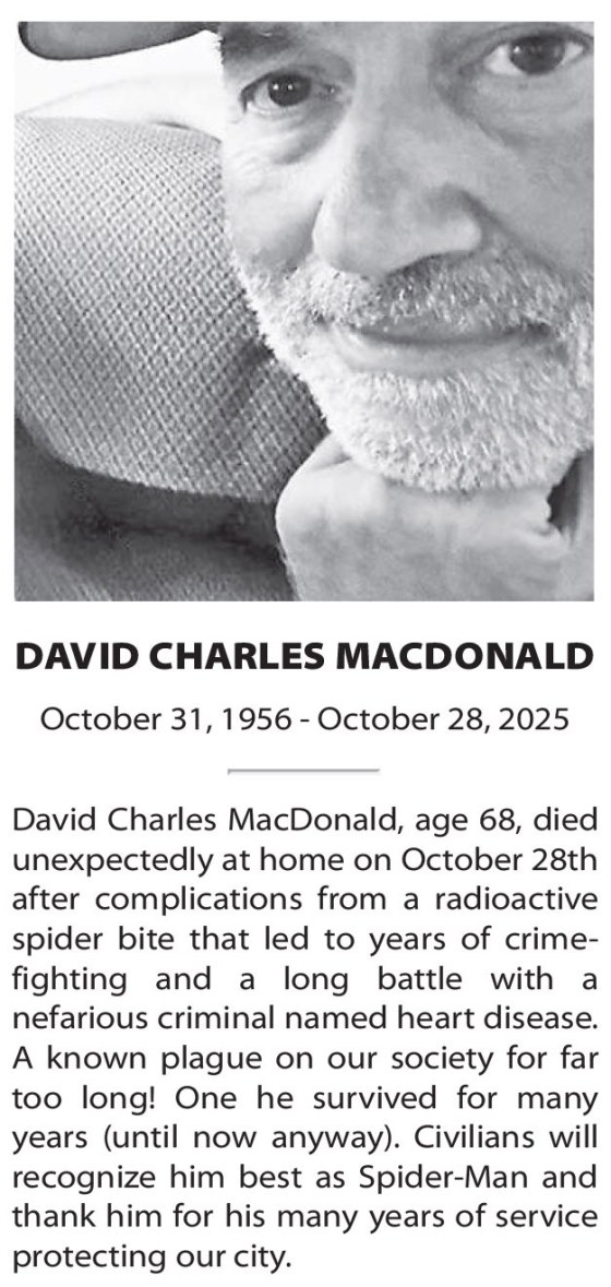 David MacDonald’s obituary says he died unexpectedly in late October “after complications from a radioactive spider bite that led to years of crime-fighting and a long battle with a nefarious criminal named heart disease.