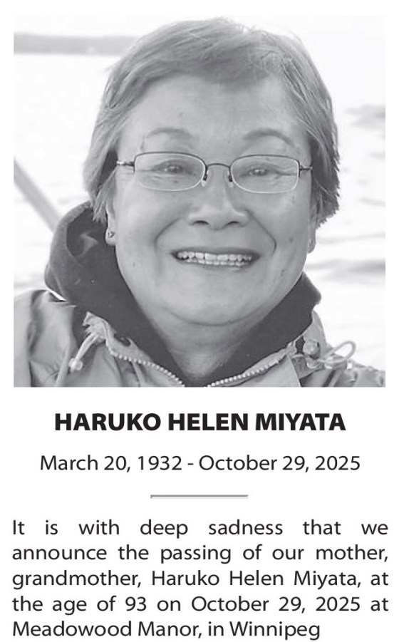Haruko volunteered in the community. She ushered at the Royal Manitoba Theatre Centre, helped the High Steppers Seniors Club, assisted people at Agape Table and delivered Christmas hampers.