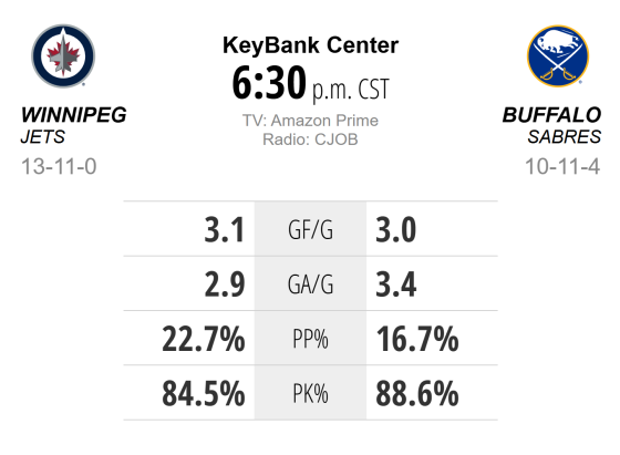 Alex Tuch (eight goals, 22 points) and Tage Thompson (12 goals, 21 points) have carried much of the load offensively for the Sabres, who are also looking for a bit more secondary scoring — much like the Jets.