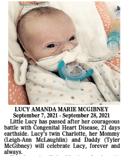 McGibney died on Sept. 28, from the congenital heart disease she was born with. She is survived by her parents, her twin sister, and many grieving relatives and family friends.