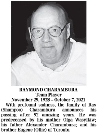 Charambura also played with the Winnipeg Rams when they won the Canadian Intermediate-Senior Men’s title in 1954 and coached the Molson Canadians Senior Men’s Fastball team to second place at the 1968 world championships.