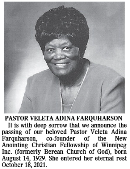 Farquharson, who was 92 when she died on Oct. 18, was originally from Jamaica and went to England to train as a nurse. She then came to Canada, went to the University of Winnipeg for geriatrics, and then worked at the Health Sciences Centre for 15 years, rising to become head nurse, before going to the Sharon Nursing Home for seven years.