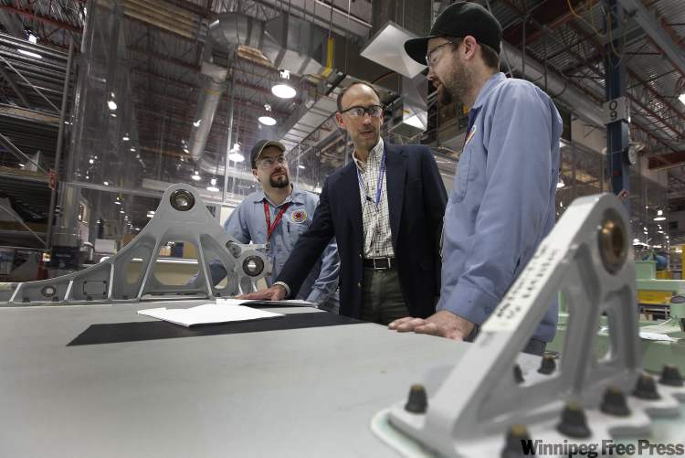 Boeing's Winnipeg general manager Dave Hyem (centre) talks with lead hands Darren Carr (left) and Allen Pytel Friday.