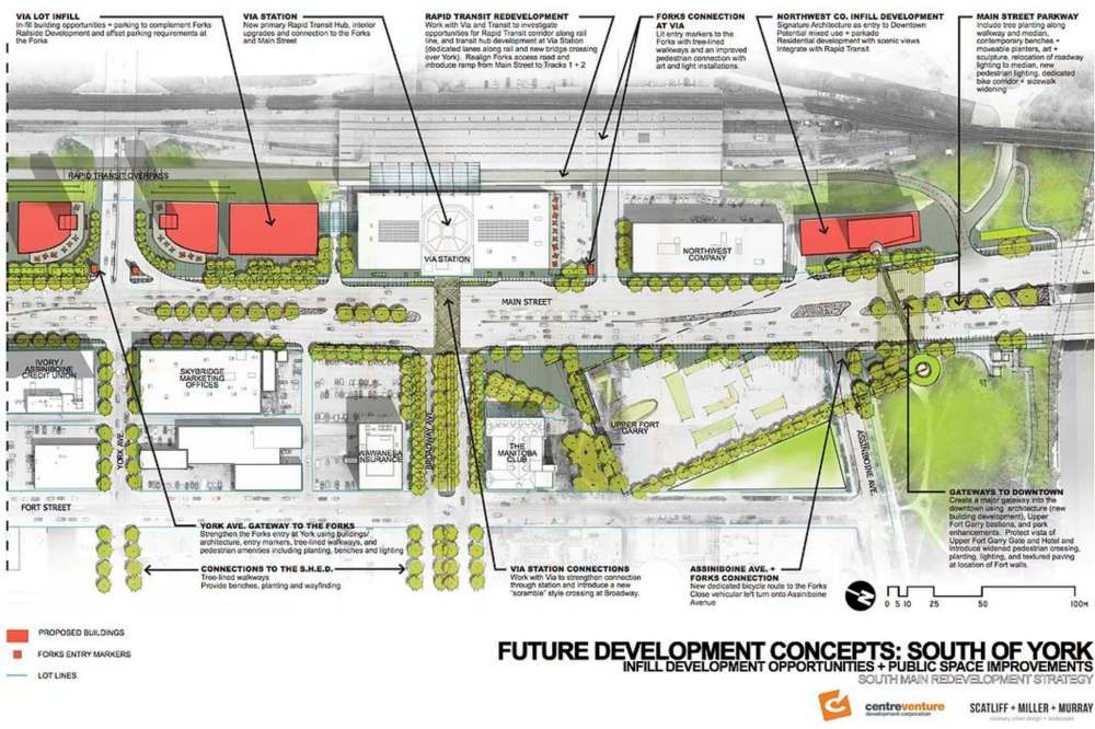 Some of the proposals outlined in the South Main Redevelopment Concepts report are: some kind of new mixed-use developments on four of the larger surface parking lots along the strip; enhancements to the streets and gateways leading from Main Street to The Forks; and construction of a new rapid-transit corridor along the railway line east of Main and the creation of a new rapid-transit hub at the Via Rail Station.