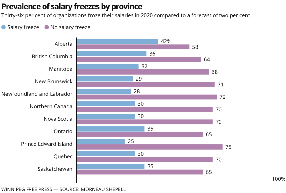 Data shared with the Free Press by Morneau Shepell, a Toronto-based human resources agency, suggests 13 per cent employers have already committed to freezing salaries next year, and 46 per cent more are on the fence about it.