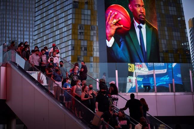 People ride an escalator along the Las Vegas Strip, Saturday, April 24, 2021, in Las Vegas. Las Vegas is bouncing back to pre-coronavirus pandemic levels, with increases in airport passengers and tourism. (AP Photo/John Locher)
