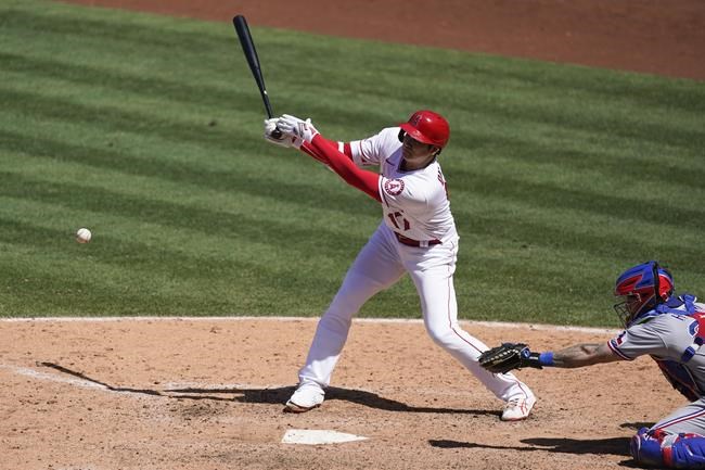 Los Angeles Angels designated hitter Shohei Ohtani (17) singles during the sixth inning of a baseball game against the Texas Rangers Wednesday, May 26, 2021, in Anaheim, Calif. (AP Photo/Ashley Landis)