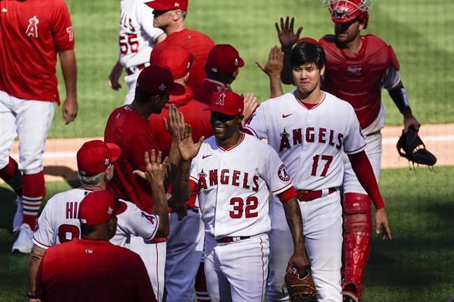 Los Angeles Angels relief pitcher Raisel Iglesias (32), designated hitter Shohei Ohtani (17), and the rest of the Angels celebrate a 9-8 win over the Texas Rangers after their baseball game Wednesday, May 26, 2021, in Anaheim, Calif. (AP Photo/Ashley Landis)