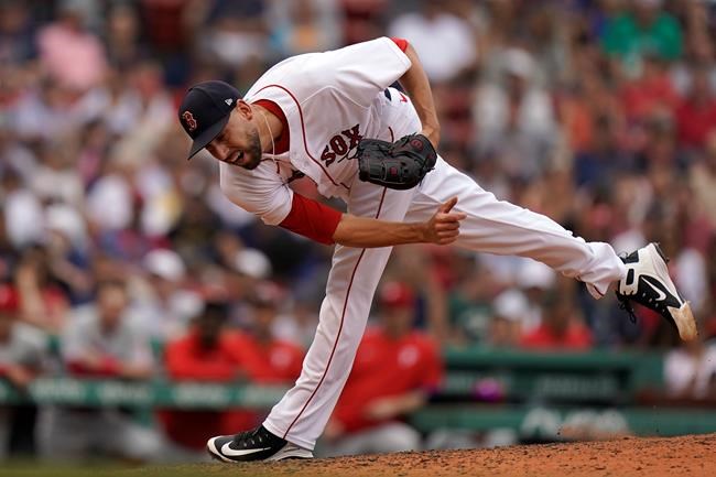 Boston Red Sox's Matt Barnes follows through on a pitch against the Philadelphia Phillies in the ninth inning of a baseball game, Sunday, July 11, 2021, in Boston. (AP Photo/Steven Senne)