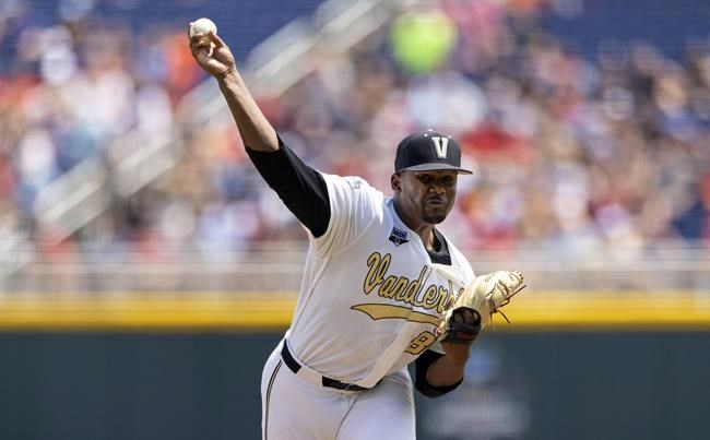 FILE - In this Friday, June 25, 2021, file photo, Vanderbilt starting pitcher Kumar Rocker (80) throws against North Carolina State in the first inning of a baseball game at the College World Series, at TD Ameritrade Park in Omaha, Neb. The New York Mets failed to sign Rocker, their top pick from the 2021 amateur draft, by the 5 p.m. EDT deadline, Sunday, Aug. 1, 2021, over concern about his medical scans. (AP Photo/Rebecca S. Gratz, File)