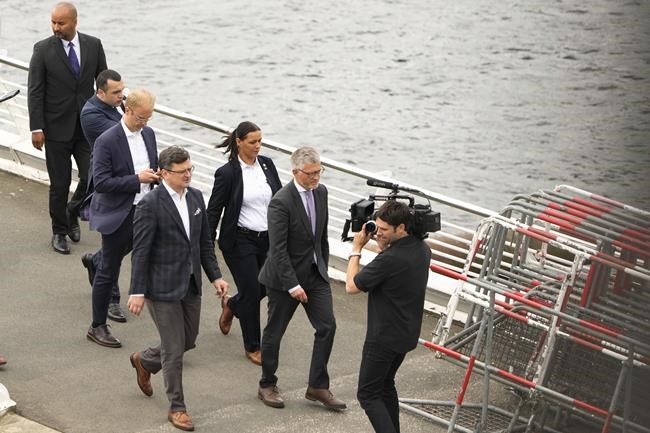 Ukrainian Foreign Minister Dmytro Kuleba, center left, surround by staff and security, walks after meetings on a street in Berlin, Germany, Thursday, May 12, 2022. (AP Photo/Markus Schreiber)