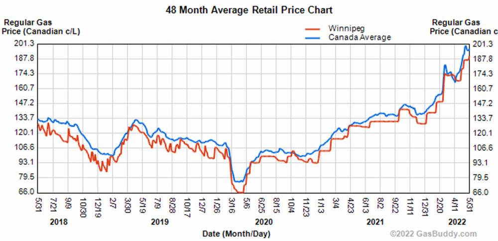 Manitoba’s regular unleaded gas prices have jumped nearly 70 cents per litre within the past year. The province saw an average $1.277 per litre on May 31, 2021, according to fuel tracking website GasBuddy.