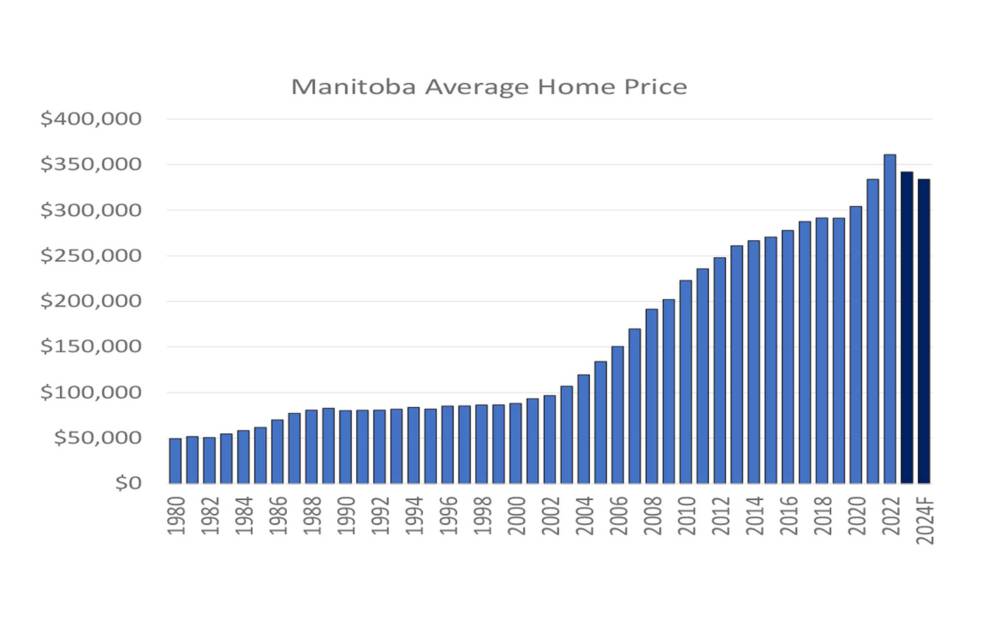 The CREA projects Manitoba home prices to decrease this year and next, though not below an average $325,000. Prices will likely stay higher than they were in 2021 and earlier, according to CREA data.