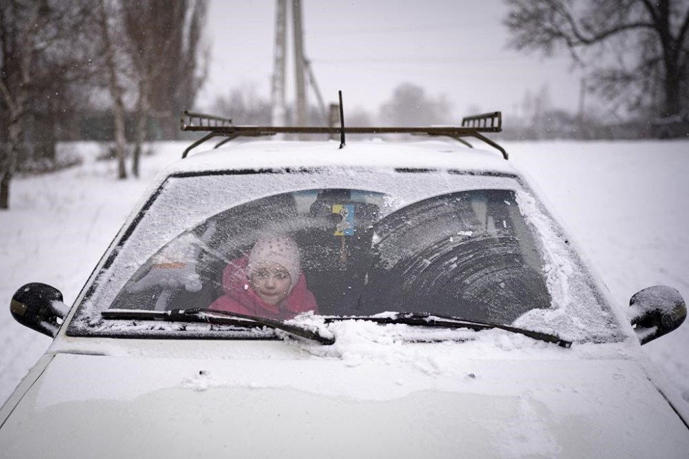FILE - A child waits inside a car as people queue outside for humanitarian aid in the village of Zelene, Ukraine, Saturday, Feb. 18, 2023. Grueling artillery battles have stepped up in recent weeks in the vicinity of Kupiansk, a strategic town on the eastern edge of Kharkiv province by the banks of the Oskil River as Russian attacks intensifying in a push to capture the entire industrial heartland known as the Donbas, which includes the Donetsk and the Luhansk provinces. (AP Photo/Vadim Ghirda, File)