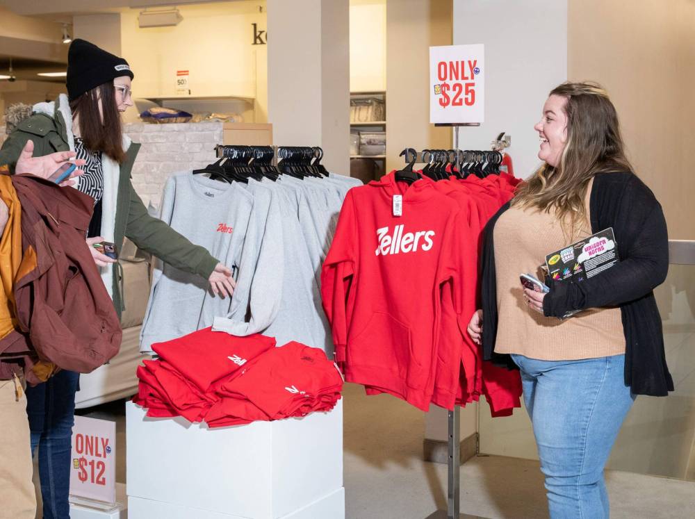 After a 30-minute cross-city drive, he went up the escalator to the second floor of the Hudson’s Bay in St. Vital Centre and was greeted by hanging signs, red sweaters and employees announcing the arrival of Zellers. Off to the side, a DJ blared old hits like Rod Stewart’s Forever Young.