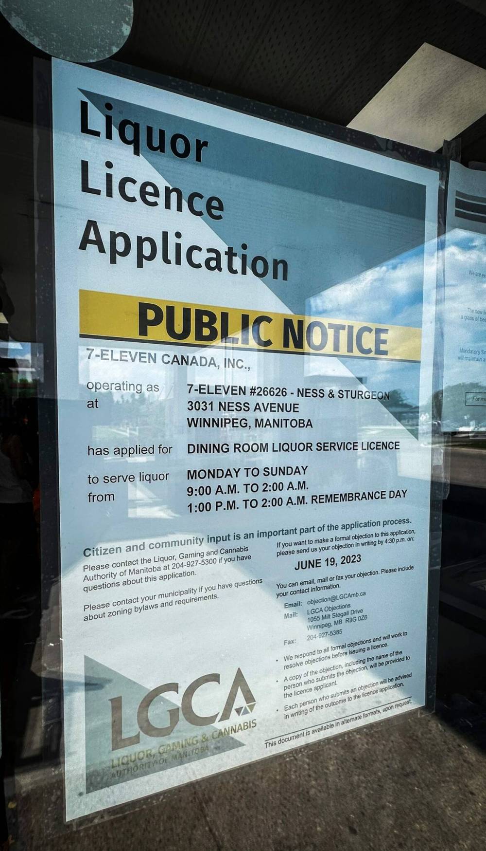 Currently, 7-Eleven’s Winnipeg liquor licence is in its public notice phase. Patrons who take issue with the application have until June 19 to make a formal complaint to the LGCA. They can do so by emailing objection@LGCAmb.ca, mailing a letter to the LGCA’s headquarters at 1055 Milt Stegall Dr., or faxing 204-927-5385.