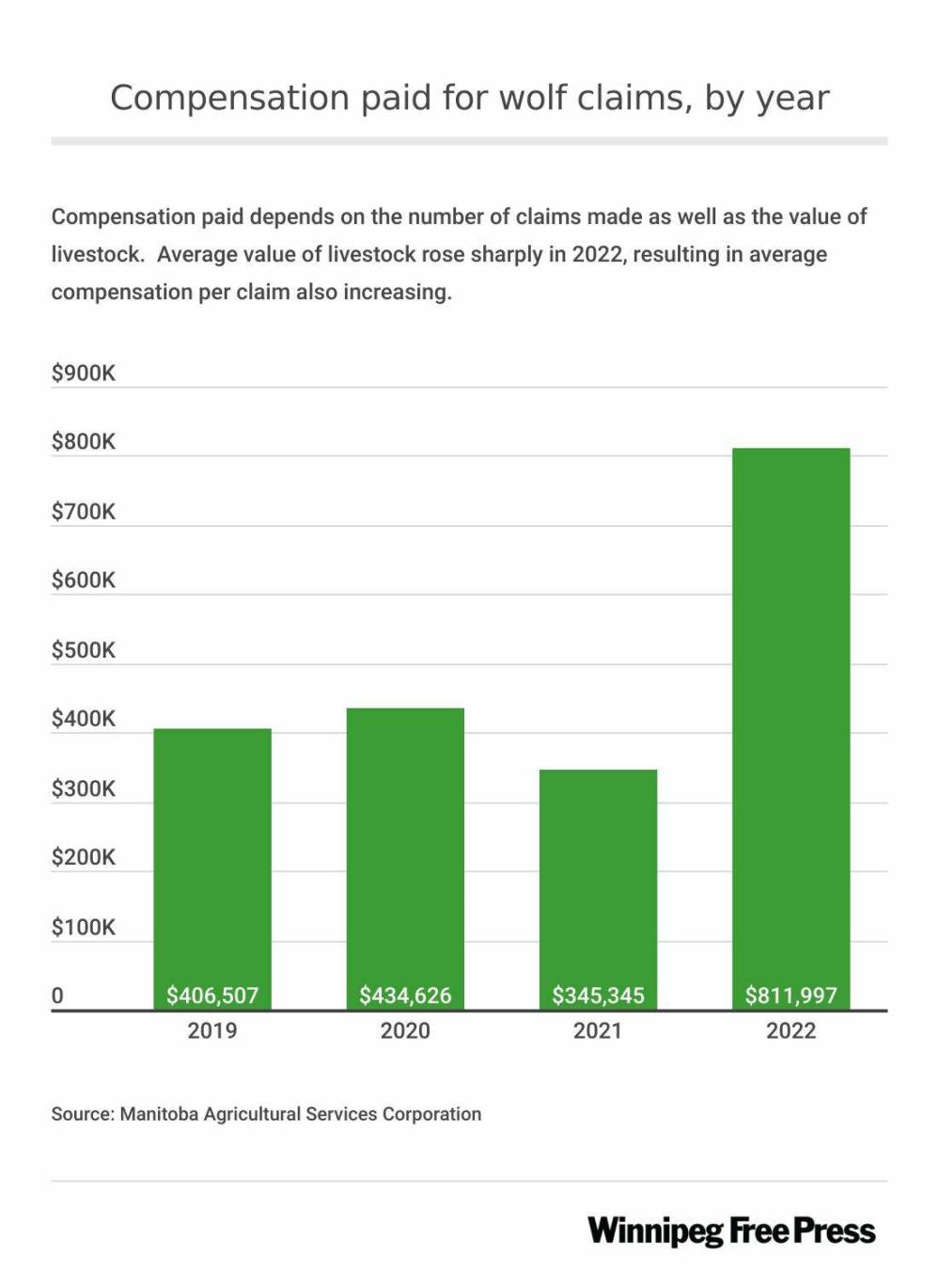 “Compensation paid is a factor of the number of claims as well as the value of the livestock,” noted David Van Deynze, MASC’s chief product officer. “The average value of livestock rose sharply in 2022.”