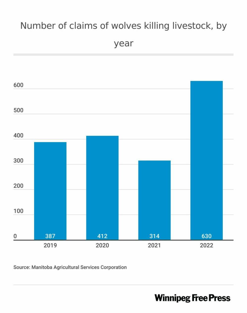 Manitoba Agricultural Services Corporation paid 630 wolf claims through its wildlife damage compensation program last year, more than doubling the 314 of 2021.