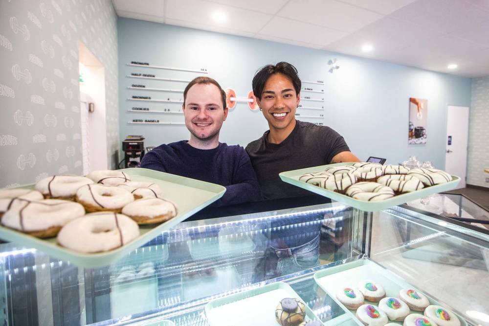 Owners Michael Myer (left) and Norman Barairo at Pronuts, a new high-protein donut shop, on Academy Road.