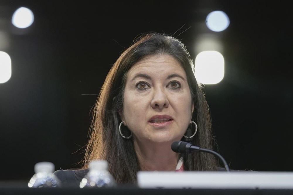 Adriana Kugler of Maryland, speaks during the Senate Banking, Housing, and Urban Affairs Committee hearing to examine her nomination to be a member of the Board of Governors of the Federal Reserve System, Wednesday, June 21, 2023, on Capitol Hill in Washington. (AP Photo/Mariam Zuhaib)