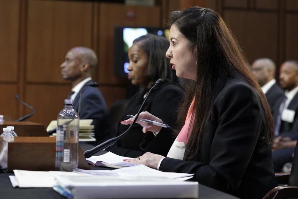 Adriana Kugler of Maryland, right, speaks during the Senate Banking, Housing, and Urban Affairs Committee hearing to examine her nomination to be a member of the Board of Governors of the Federal Reserve System, Wednesday, June 21, 2023, on Capitol Hill in Washington. (AP Photo/Mariam Zuhaib)