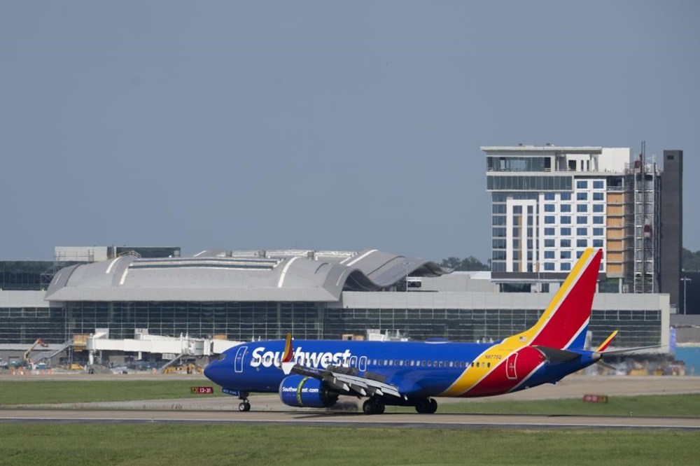 A Southwest Airlines plane moves across the tarmac at Nashville International Airport Friday, July 21, 2023 in Nashville, Tenn. A new Tennessee law that installs a state takeover of the board that oversees Nashville's airport has created confusion about who is actually running the facility. (AP Photo/George Walker IV)