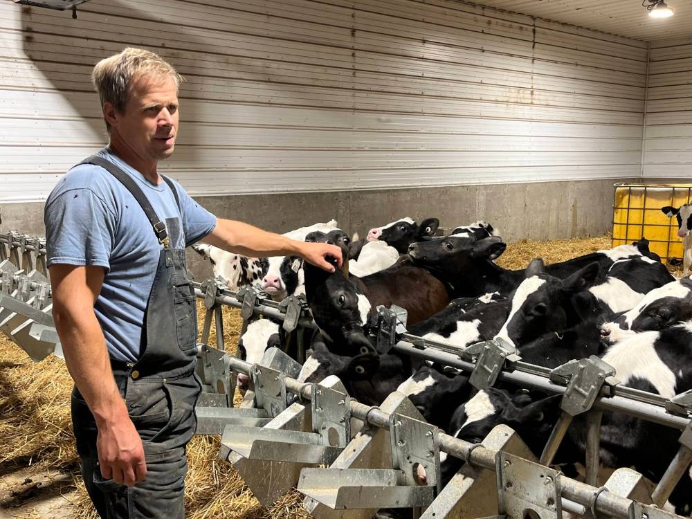 Joshua Verhoog with a group of calves at Moonshadow Holsteins. The calves, nearing adulthood, are still bottle fed.